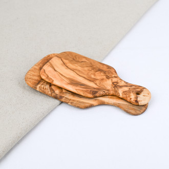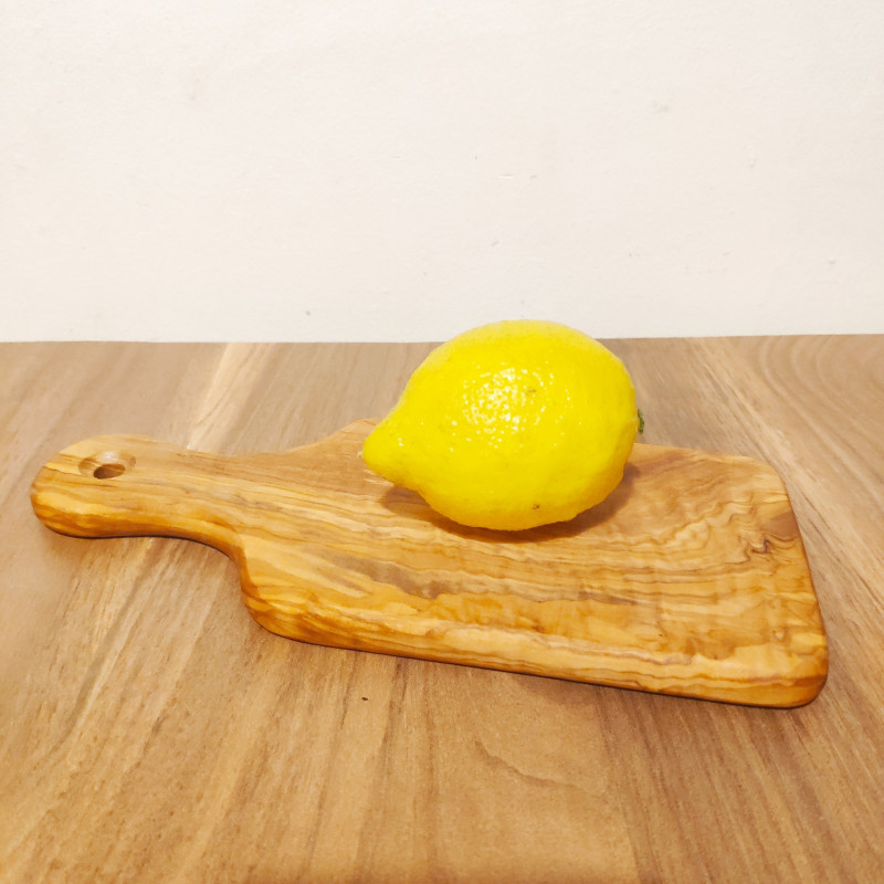 Small, thin olive wood cutting board ideal for cutting herbs, vegetables and fruit, or for presenting homemade aperitifs. The perforated handle lets you hang it up for storage.
