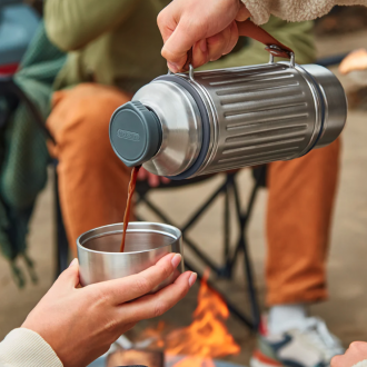 Its clever advantage? It's equipped with two stainless steel cups, screwed on either end. Perfect for sharing a coffee, tea or cold beverage with your partner at any time of day.