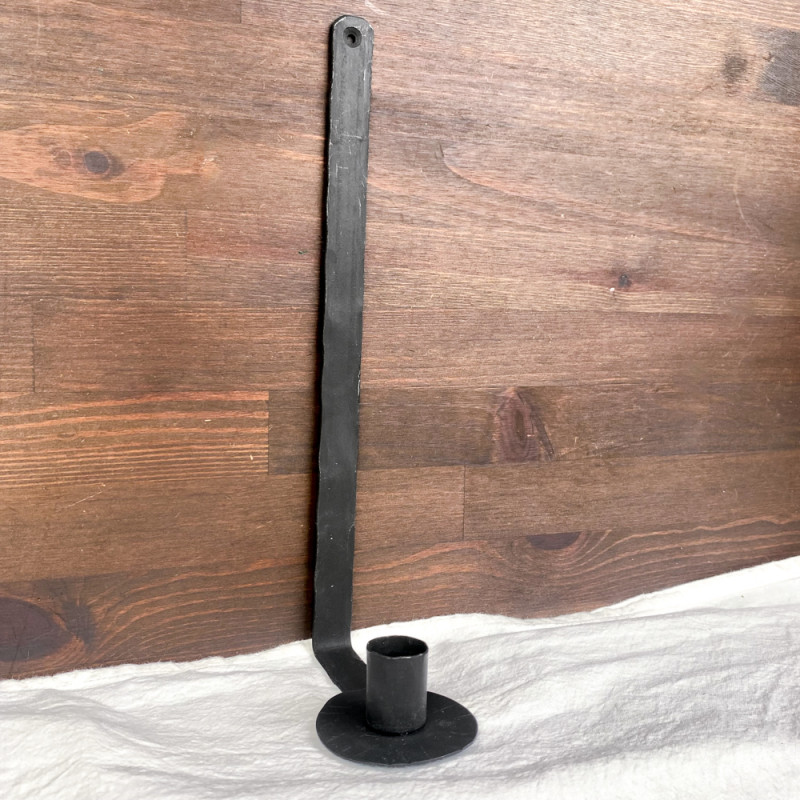 Add a touch of sophistication to your walls: this sleek, elegant black forged metal candleholder provides candlelight with a contemporary aesthetic.