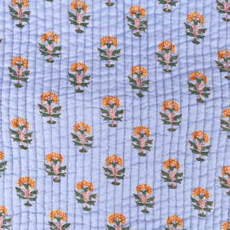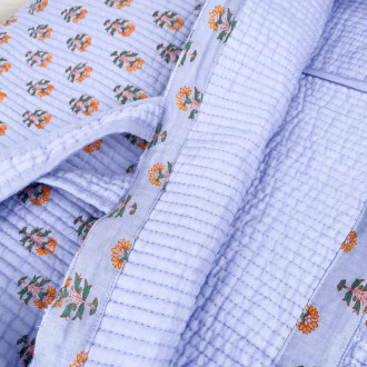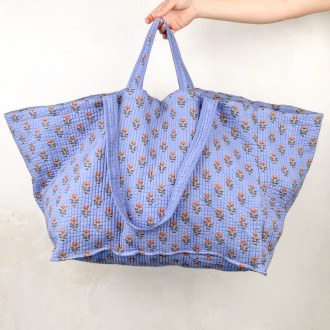 Blue Provencal bag with floral motifs, made from 100% cotton, quilted in a boutis style.