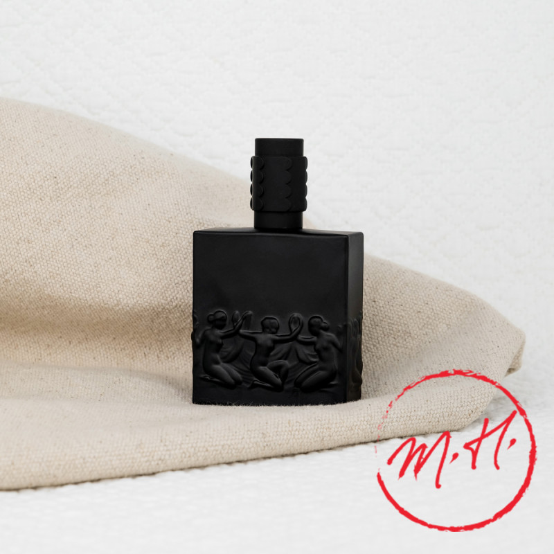 The matte black glass bottle bears the signature of the master glassmaker. In the 1930s, René Lalique engraved a frieze of naiads, the nymphs of springs and rivers, for Molinard. The female bodies intertwine in bas-relief on the dark glass, creating a play of light and shadow. The protruding edges of the thick glass catch the light, while the sculpted cap completes this Art Deco architecture. Habanita fragrance deserves its exceptional case.