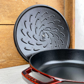 This Staub casserole, handmade in France, has all the assets: it issuitable for all types of fires, has a neat design, an optimized weight, an elaborate lid*, and a superior quality mat enamel interior.