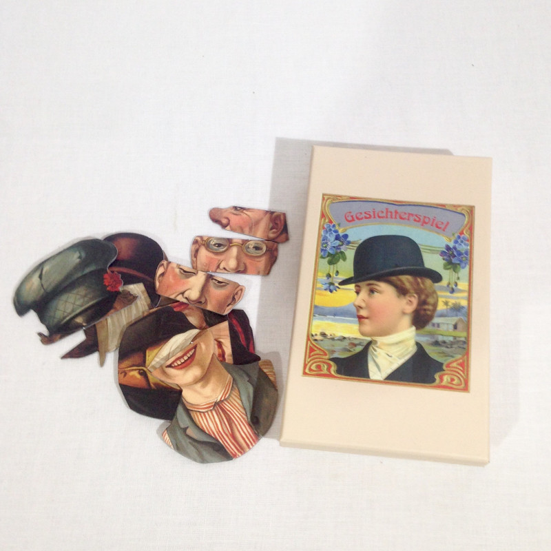 Exquisite corpse or face game. Use the 36 cardboard parts (lower face, eyes, upper face) to create unusual faces! Made in Germany. Delivered in a cardboard box. Size of the box : 20 x 12 x 3,5cm.