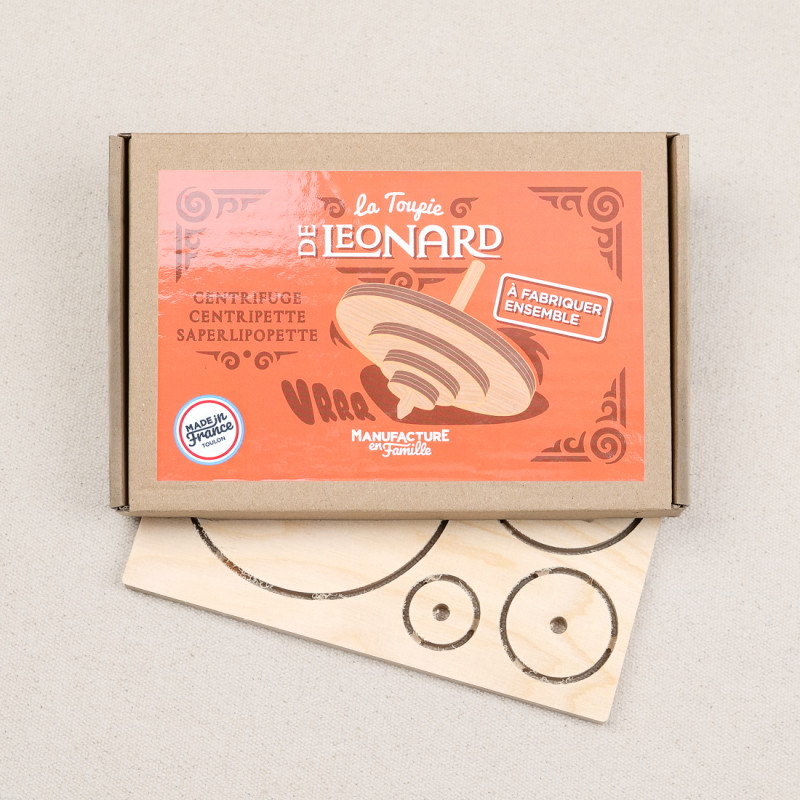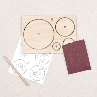 In the box you'll find 4 pre-cut wooden discs, a polishing sheet to smooth the pieces, and a wooden pick to assemble the top and make it spin.