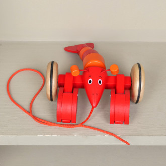 This wooden lobster on wheels with charming round eyes waddles as the child takes it for a walk.