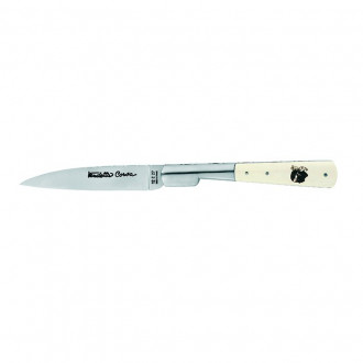 Knife "VENDETTA CORSA" with its steel blade 12 C 27 guilloched back, its handle 12,5 cm in white bone with head of Moor, stainless steel bolster and guilloched spring.
