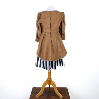 The Princesse Pirate costume combines elegance and comfort. It consists of a striped dress embellished with lace and a long velvet-effect jacket for a neat, wearable outfit. Made in France in the Centre-Val de Loire region, it features meticulous details and materials designed to last and move easily.