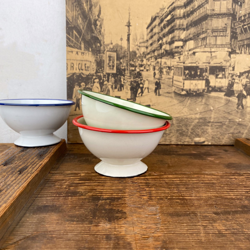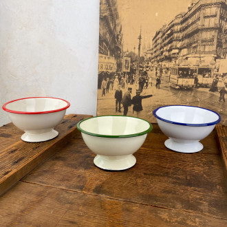 White enameled sheet metal footed bowl with navy blue trim, for a retro yet timeless table.