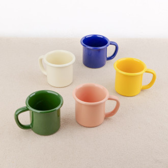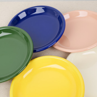 Available in five shades (ecru, navy blue, pink, green and yellow), they can be matched or mismatched at will. Tableware that adapts effortlessly to evening meals, picnics or occasional use.