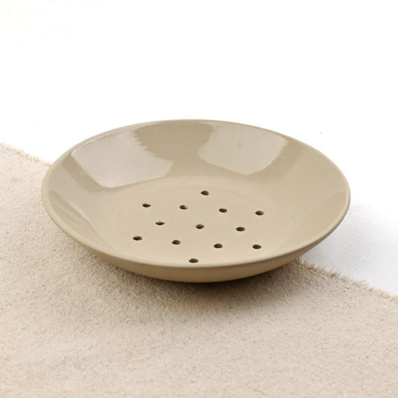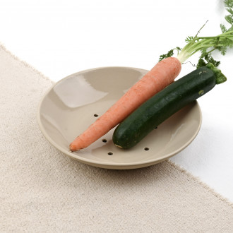 Hollow shaped plate in natural stoneware; it will be perfect for draining radishes, asparagus, red fruits etc. and adds a little touch of authenticity in the kitchen.