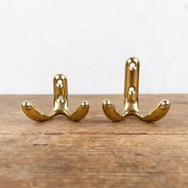 Made by a historic Italian manufacturer, this solid brass double hook is secured with two screws. The 1.3cm-wide bracket has two holes to hold it to a wall or door. It can be used to hang household items such as keys or a tote bag.