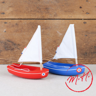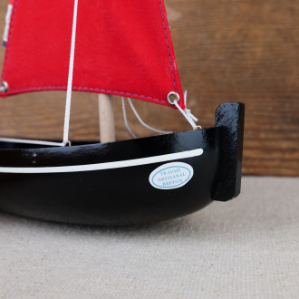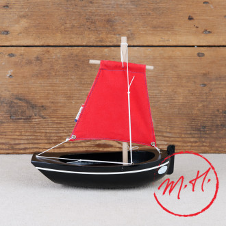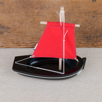 The misainier with red sail and black hull, made by Tirot, takes its design cues from the small fishing boats that once plied the Breton coast. Made entirely of Breton beechwood, it is handcrafted in a simple, durable spirit.