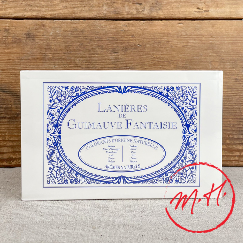 Box of 10 strips of traditional marshmallow with natural flavors of orange blossom, raspberry, anise, lemon and violet.
