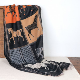 The warmly colored scarf features beautiful equestrian motifs, while the bracelet combines bovine leather and brass worked by the company's craftsmen.