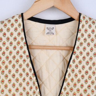 This quilted Provencal cardigan celebrates the understated elegance of traditional southern textiles, with its calisson motif printed on a luminous beige background.