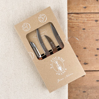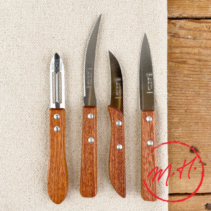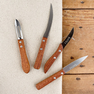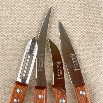 The blades are in stainless steel, the peeler: length 15.5 cm, the special knife tomatoes: L 19.5 cm, the peeler Bec d'Oiseau: L 15.5 cm, the knife of Office: L 17.5 cm