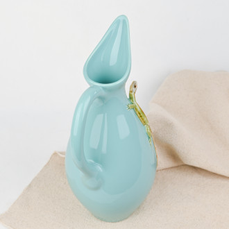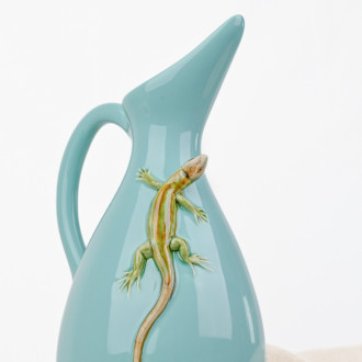 A beautiful turquoise-blue decanter adorned with a small lizard.