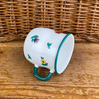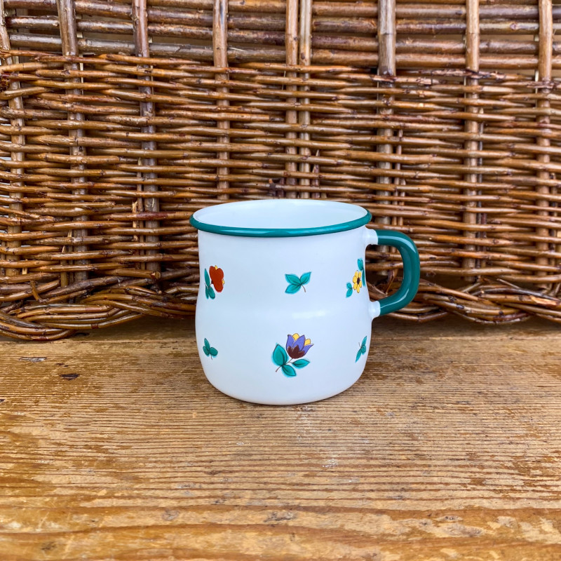 Charming steel mug enamelled white and green with small flowers. Sold individually.
