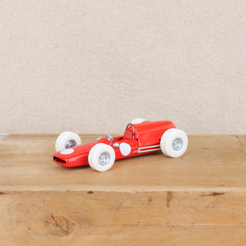 This pretty red metal racing car with white rubber wheels is reminiscent of the legendary racetrack cars of the 50s and 60s. With its retro lines, meticulous detailing and shiny finish, it will appeal to children and collectors of vintage toys alike.