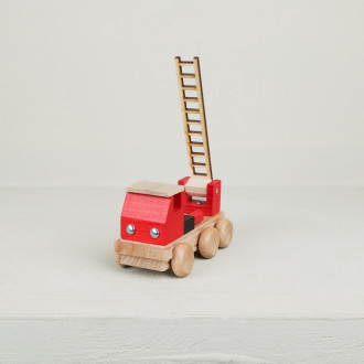 This wooden fire truck lets children create play scenes around firefighting. The vehicle features a steerable ladder that can be manipulated during play.