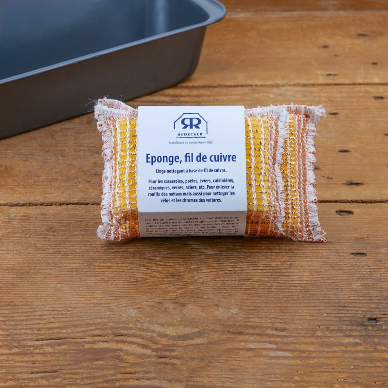 Set of 2 sponges with instructions for their best use, made of woven copper wire and sponge. Dimensions: 7 x 11 cm and 10 x 14 cm.