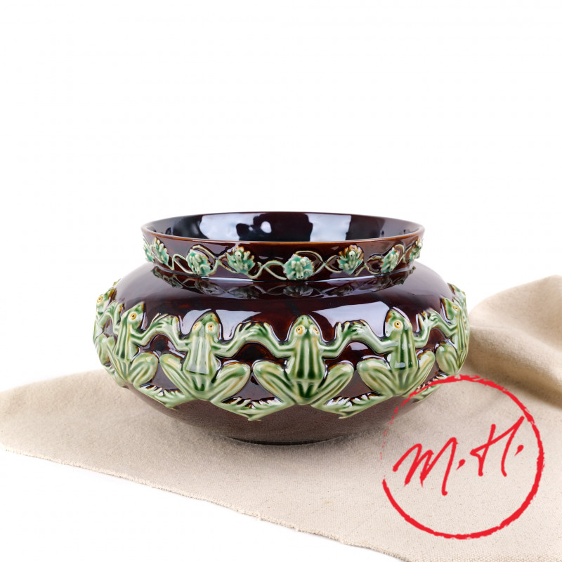 This glazed terracotta planter, painted a beautiful glossy black, is decorated with a frieze of frogs. A symbol of both fertility and resurrection, the frog adorning this traditional decorative object celebrates springtime renewal.