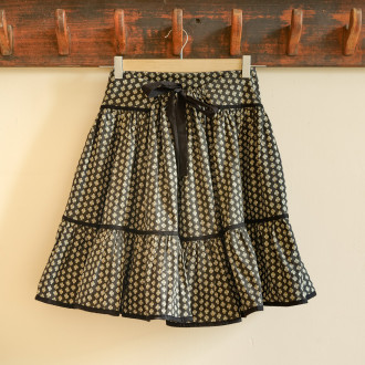 The adjustable waistband with black ribbon tie at the back provides a precise fit, keeping the skirt firmly in place while nicely marking the waistline. This elegant finish accentuates the structured effect of the mid-length cut, while its Provencal fabric adorned with yellow calissons and accented with black piping adds finesse and character.