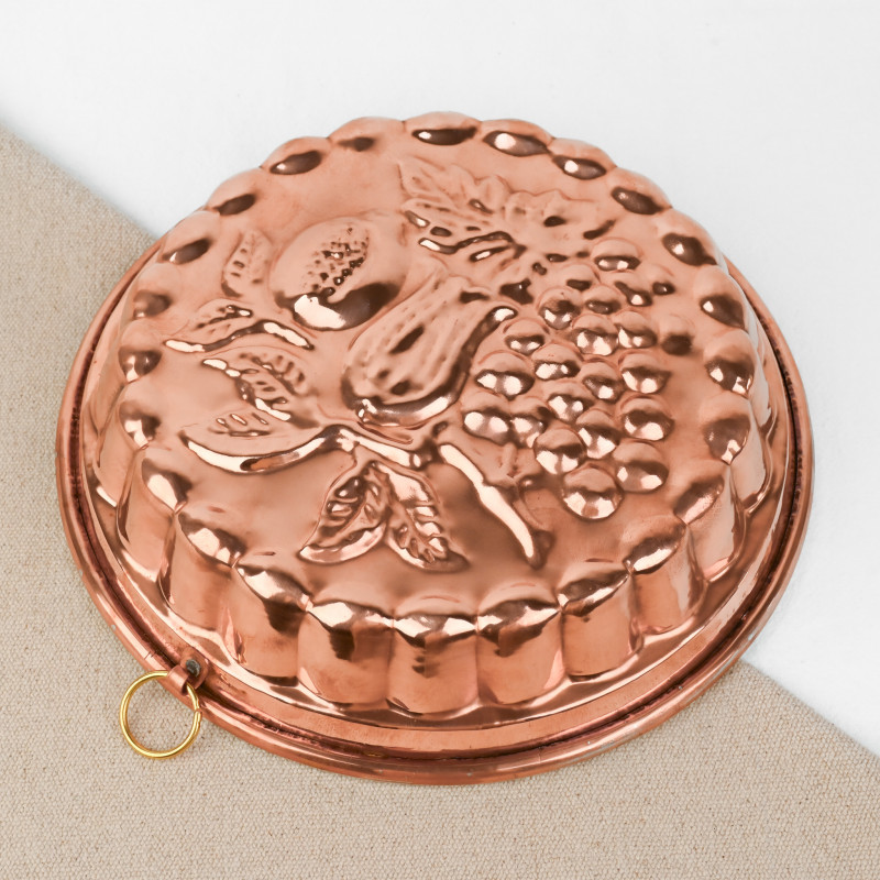 Elegant copper cake mould, decorated with attractive fruit motifs in relief, perfect for original pastries.