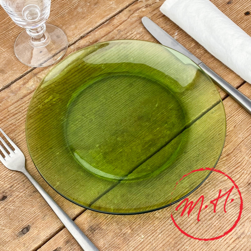 A Duralex tempered glass dinner plate, with timeless lines and a beautiful green color, very 70's!