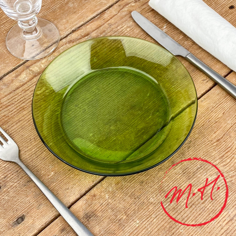 A Duralex tempered glass soup plate, with timeless lines and a beautiful green color, very 70's!