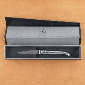 The emblematic Laguiole knife, revisited by designer Philippe Starck, gives birth to a resolutely contemporary model. With its solid aluminum handle and shiny finish, it brings a modern touch to the traditional silhouette of the Laguiole folding knife.