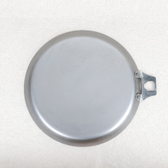 A steel pancake pan designed for easy storage, thanks to its removable handle system.