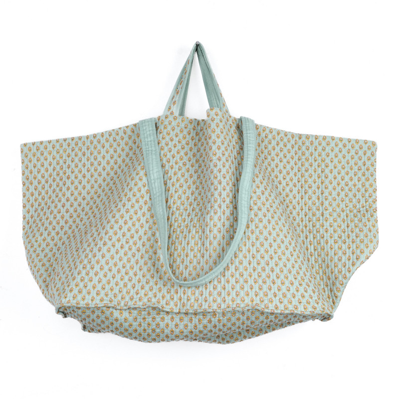 Clever because of its maxi size, two pairs of handles and light weight, this tote bag is made from 100% cotton quilted boutis-style fabric, making it pleasant to touch and wear.