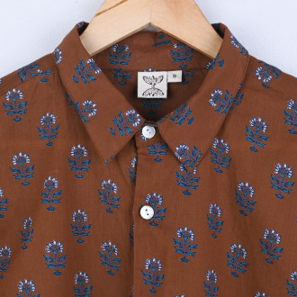 This cotton shirt celebrates the Indian textile tradition with a hand-printed dandelion motif on a deep brown background.