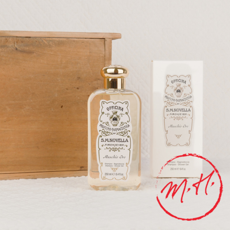 Muschio Oro shower gel and shampoo offer gentle daily cleansing that respects both skin and scalp. Formulated with plant-derived ingredients, it cleanses effectively without aggressing or drying, leaving skin supple and hair light.