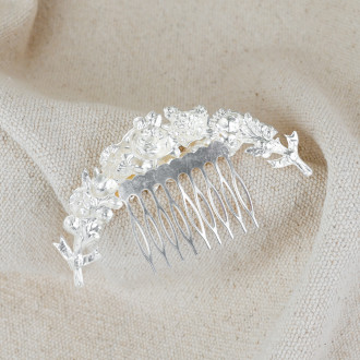 Add a touch of delicacy to your hairstyles with this copper barrette comb adorned with a garland of roses, here in a silver finish. Its finely worked motif evokes 19th-century floral ornaments, for a look that's at once sober, elegant and full of grace.