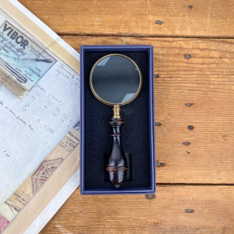 Bring a nicely retro touch to your workspace with this brass magnifier and its dark wood handle.