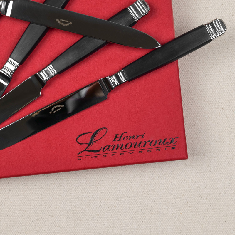This boxed set includes six knives from Lamouroux cutlery, hand-assembled in France using traditional methods. Their deliberately sober design highlights the material and the right proportions, with clean lines that blend naturally into any table.