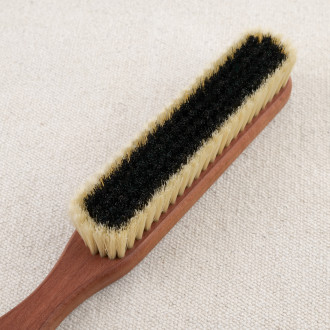 The inner part is made of hard black bristles, the outer part is made of soft bristles for a silky finish. The oiled pearwood handle provides a good grip, while the leather tie allows for hanging storage