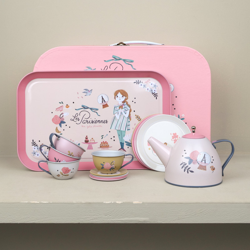 A pretty pink and flowered suitcase contains a tea set, precious and elegant.