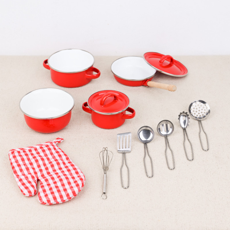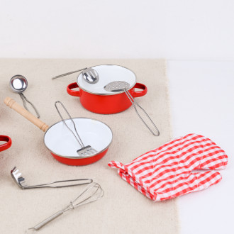Large pot with lid, small pot with lid, bowl, oven mitt, whisk, spatula, slotted spoon, noodle spoon, soup spoon, skimmer.