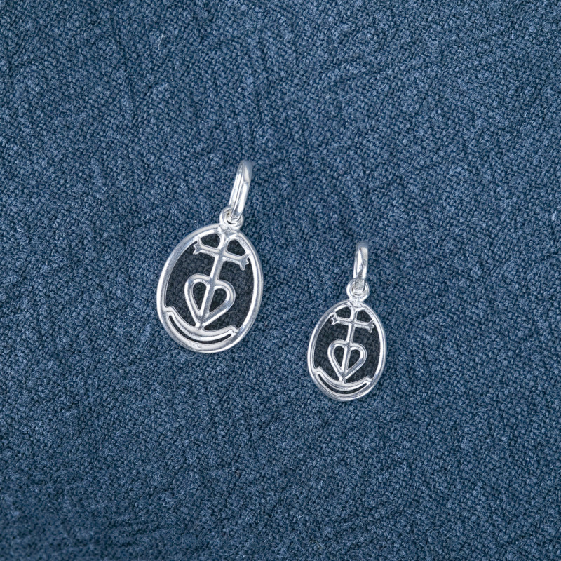 Pendant Camargue cross, also called cross of Camargue, cross of the gardians or cross of the Saintes Maries de la Mer. Created in 1926 at the request of the Marquis de Baroncelli, it symbolizes the gardian nation by associating the gardians by the tridents at each end of the cross (Faith), the fishermen by the anchor (Hope) and the Holy Marys by the heart (Charity).