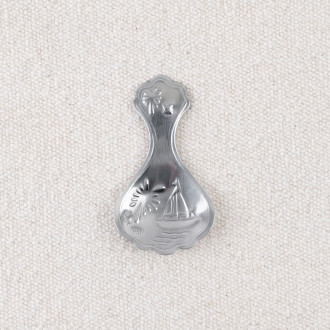 Cette cuillère de mesure est en léger acier inoxydable et est décoré finement de petits motifs représentant un voilier et un palmier.