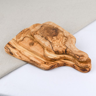Planche à découper à rigole en bois d'olivier, idéale pour les viandes ou les légumes juteux. Avec son élégante forme brut elle peut aussi être utilisée pour la présentation.