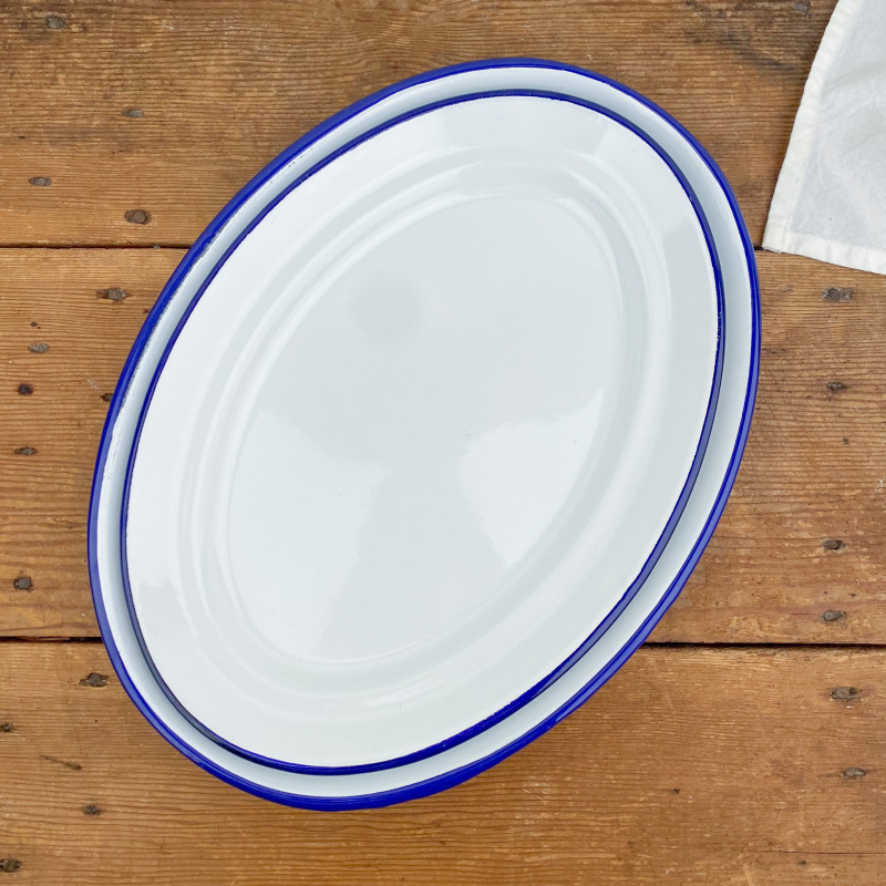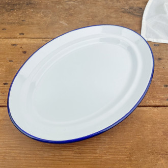 Plat de service en émail blanc liseré bleu