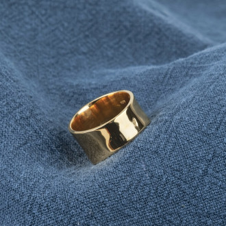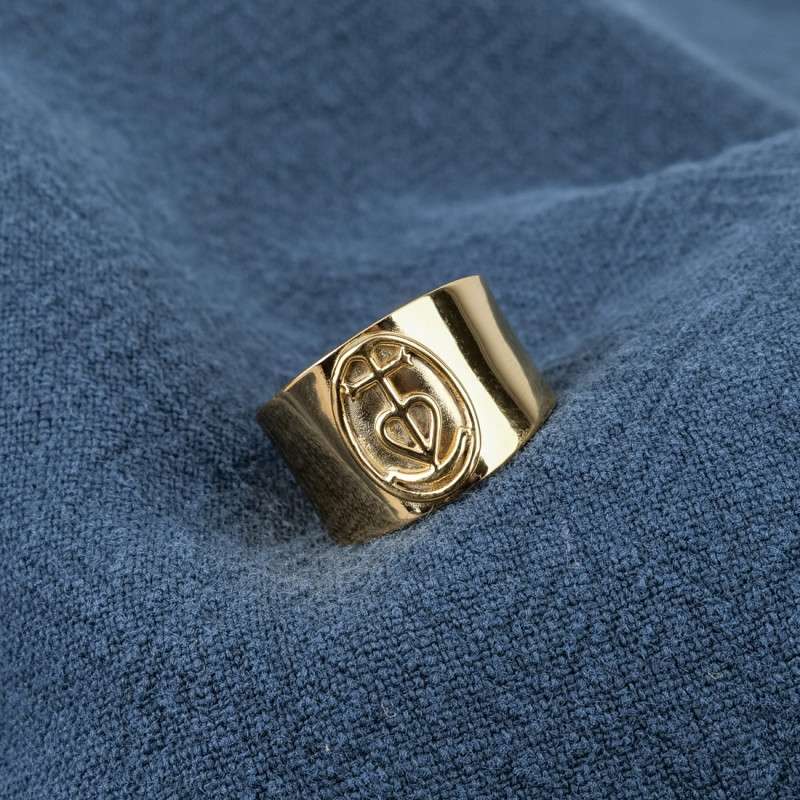 La bague est confectionnée dans un format large qui fait penser au style des chevalières traditionnelles.