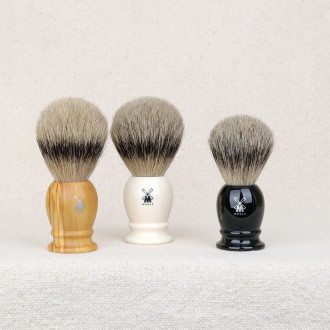 Le manche du blaireau de rasage existe en 3 finitions: résine polie de haute qualité couleur ivoire ou noire ainsi que bois d'olivier.