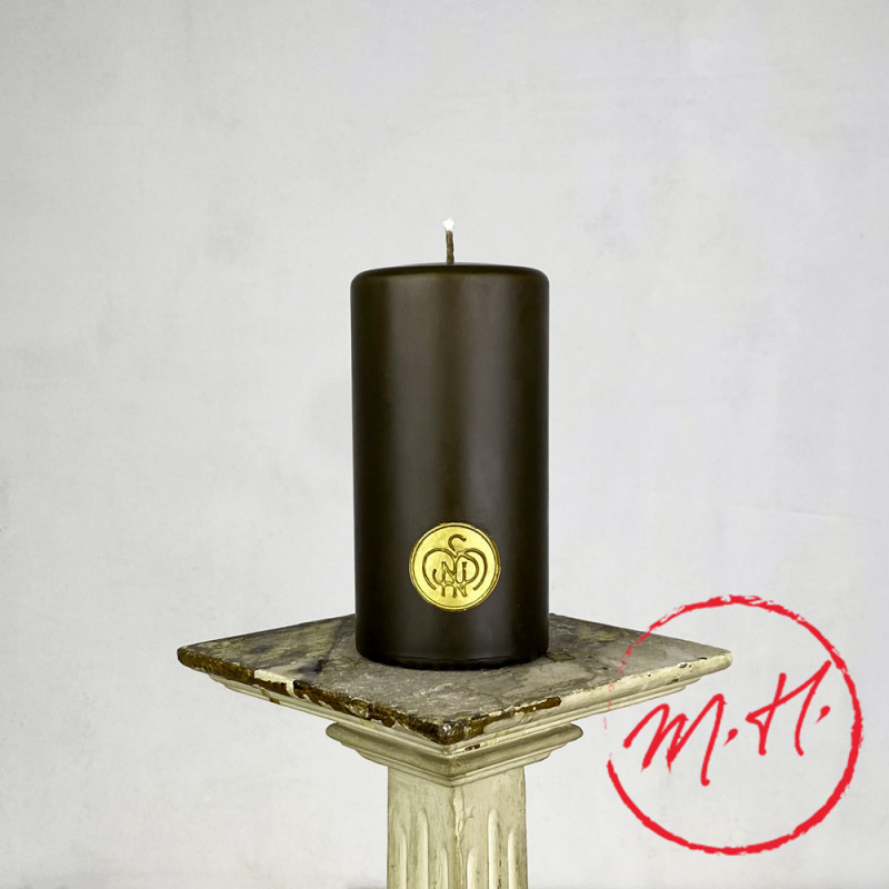 On aime la couleur brune de la haute bougie cylindrique avec le blason doré peint à la main pour une décoration d'intérieur au style baroque et sophistiqué.