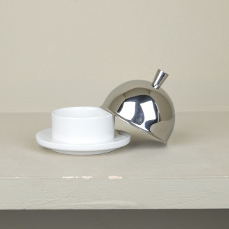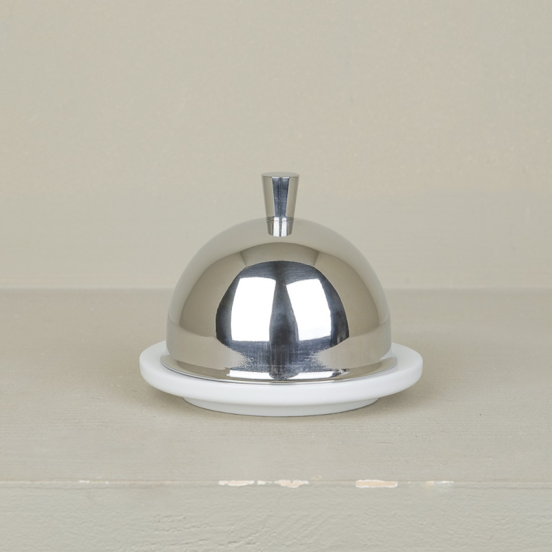 Ce beurrier en porcelaine, muni d’une cloche en inox brillant, protège efficacement le beurre tout en le mettant en valeur.
