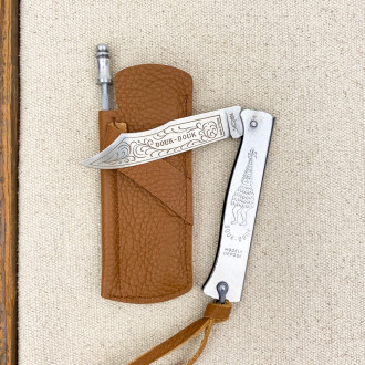 Ce grand classique est ici tout inox, manche et lame, avec son étui de cuir camel ou noir, à accrocher à la ceinture, et un mini fusil pour l'affûtage. Élégant et pratique.
